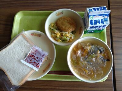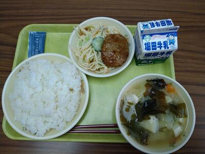 さて、今日の給食です。キムチスープ、枝豆と豆腐のコロッケなどです。
