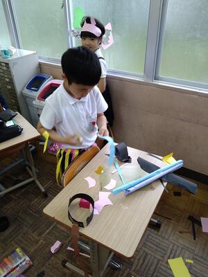 2年生教室では、図工の学習中。「わっか」を使っての装飾です。