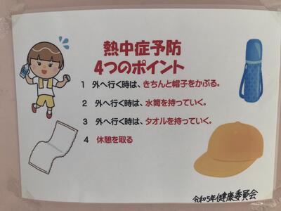 今日は、久しぶりの晴天!晴れということは、心配されるのが熱中症ですよね。最近の雨で暑さに慣れていない分、今日は一日熱中症の心配がされました。廊下には、健康委員会からの熱中症予防のポスターが掲示してあります。