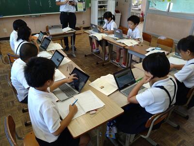 3年生の皆さん、朝も一番に運動場に出て行きます。タブレットもとってもうまくつかって学習していました。