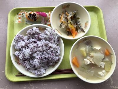 さて、今日の給食のテーマは天草!「たこ飯」「だご汁」「いわし煮」です。美味しくいただきました。