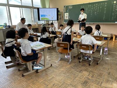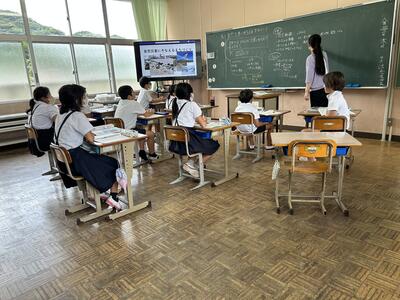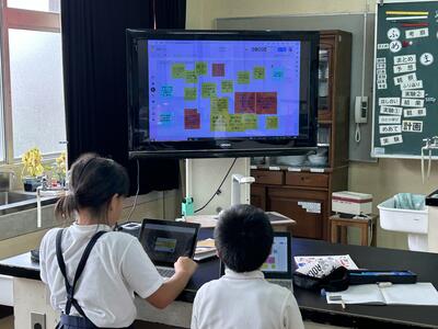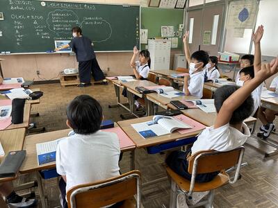 今日は、天草市教育委員会の先生、御所浦中学校の先生、東京からの学生さん(キャラバン隊)が来校されました。2時間目の5年生の国語の授業では、タブレット端末に自分の考えを残しながら、話し合いが行われました。児童は、緊張しながらも話し合いが少しずつ活発になっていく姿が見られました。緊張の中での授業、これも大切な経験です。