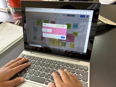 3年生理科。一人一台のタブレット型端末を使って、協働的な学びを進めています。自分の考えをデータ上で付箋に書いていきます。友だちの考えも見ることができますので、自然と自分と友達を比較しながらやっている子どももいました。