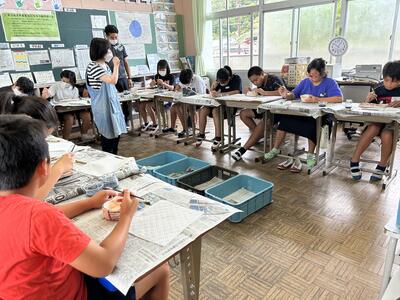 6年生。作陶体験で絵付けが行われました。1学期の製作の時にお世話になった窯元様に絵付けでもお世話になりました。素焼きでできあがった自分の作品に子供たちも喜んでいました。