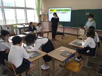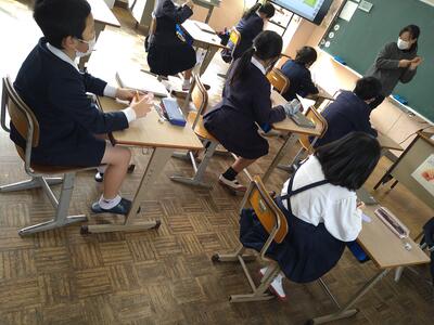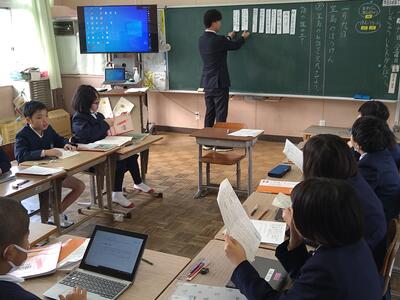 今日は、天草市教育委員会の先生、御所浦中学校の先生、東京からの学生さん(キャラバン隊)が来校されました。2時間目の5年生の国語の授業では、タブレット端末に自分の考えを残しながら、話し合いが行われました。児童は、緊張しながらも話し合いが少しずつ活発になっていく姿が見られました。緊張の中での授業、これも大切な経験です。