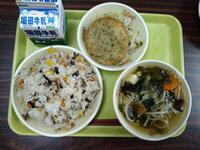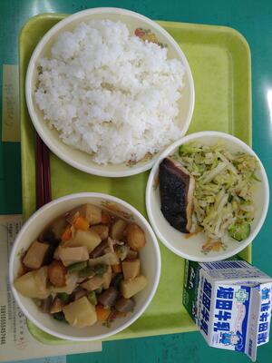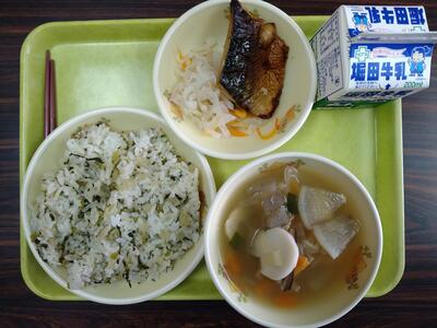 最後に今日の給食です。ダイコン菜ごはん、雑煮、サバの照り焼き、三色なますです。