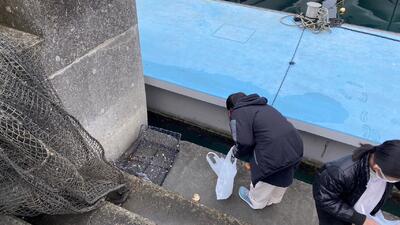 これまでヒラメや車エビの稚魚放流を経験させていただきましたが、今日はマダイの放流を体験しました。稚魚のつかみ方にも慣れてきたのか、これまで以上にスムーズに放流できていたと思います。