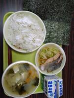 最後に今日の給食です。ダイコン菜ごはん、雑煮、サバの照り焼き、三色なますです。