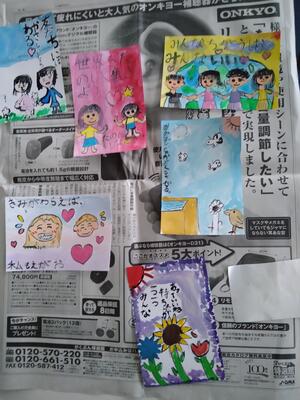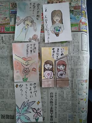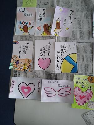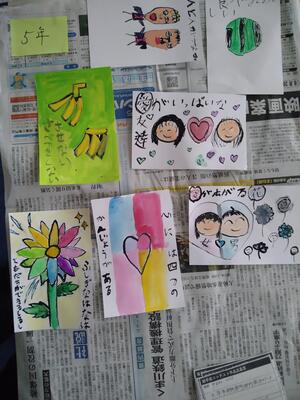 最後に昨日の午後は、「障害のある人もない人もともに暮らす」をテーマに4~6年生が絵手紙を書きました。紹介します。