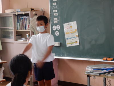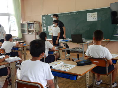 今日は、天草市教育委員会の先生、御所浦中学校の先生、東京からの学生さん(キャラバン隊)が来校されました。2時間目の5年生の国語の授業では、タブレット端末に自分の考えを残しながら、話し合いが行われました。児童は、緊張しながらも話し合いが少しずつ活発になっていく姿が見られました。緊張の中での授業、これも大切な経験です。
