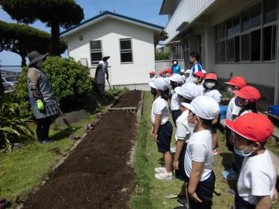 そのころ、1年生と2年生は、荒木さんと田中さんと苗うえでした・・・。