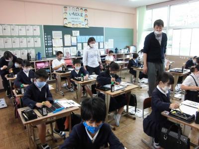 今日は、天草市教育委員会の先生、御所浦中学校の先生、東京からの学生さん(キャラバン隊)が来校されました。2時間目の5年生の国語の授業では、タブレット端末に自分の考えを残しながら、話し合いが行われました。児童は、緊張しながらも話し合いが少しずつ活発になっていく姿が見られました。緊張の中での授業、これも大切な経験です。