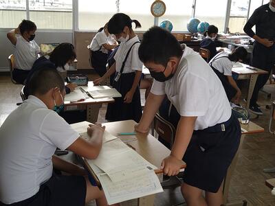 6年生・・・。社会科で裁判所のはたらきなどについて学習中。5問テストを実施中。できなかった問題を自学で頑張ろう!と家庭学習への意欲につなげていました。
