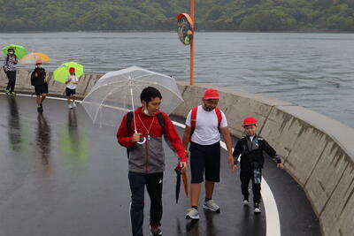 一時間目の身体測定を終え、しばらくすると雨雲が薄くなるという予報を信じて、小雨でしたが、傘を差して出発しました。今年の歓迎遠足は横浦港から旧御所浦北中学校で1年生を迎える会を行い、与一が浦港まで歩きます。
