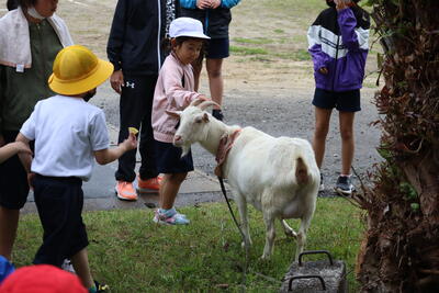 旧御所浦北中グラウンドには、ヤギのさくらちゃんとヨモギちゃんが草を食んでいます。