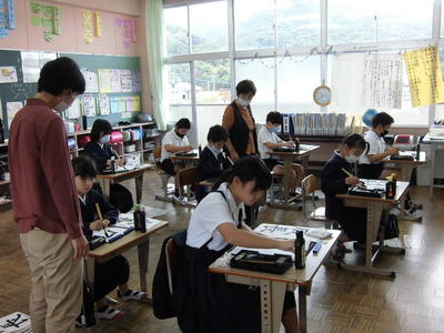 3年生、濵本様、早速の毛筆指導、ありがとうございます・・・。