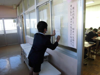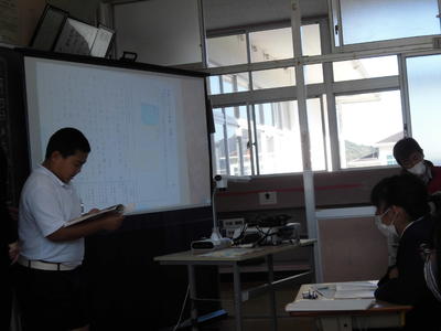 今日は、天草市教育委員会の先生、御所浦中学校の先生、東京からの学生さん(キャラバン隊)が来校されました。2時間目の5年生の国語の授業では、タブレット端末に自分の考えを残しながら、話し合いが行われました。児童は、緊張しながらも話し合いが少しずつ活発になっていく姿が見られました。緊張の中での授業、これも大切な経験です。