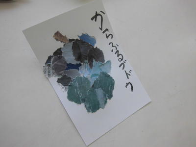 これは水切り絵手紙と言って、カラーの新聞等の素材から使いたい色の部分をちぎり、パッチワークで貼り集めて、素材とはちがう絵を仕上げるというアート作品です。
