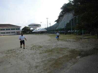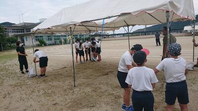 バスボートを見送った先生たちは、応援団担当の先生たちががんばっている間に、グラウンドの整備(主要なライン引き)を行っている・・・。