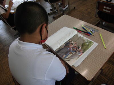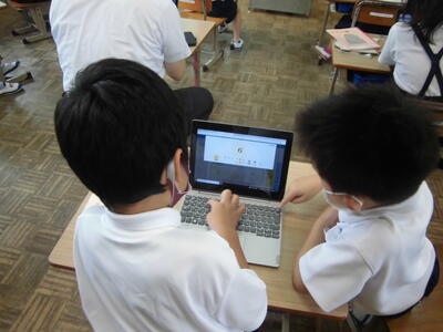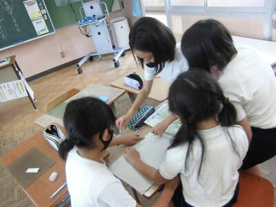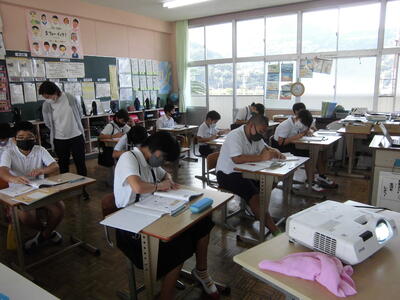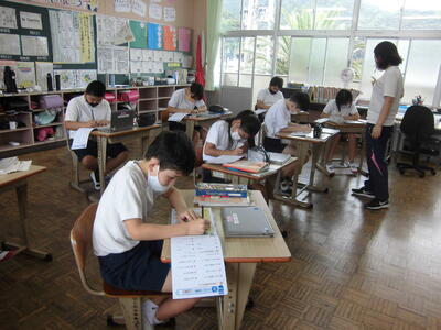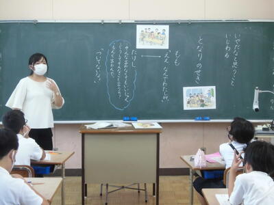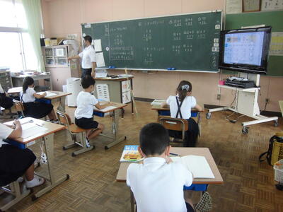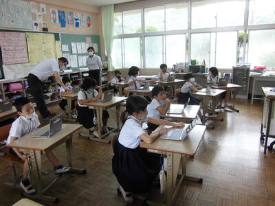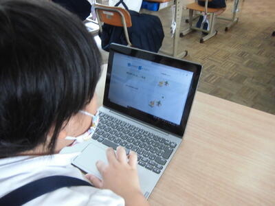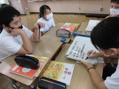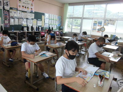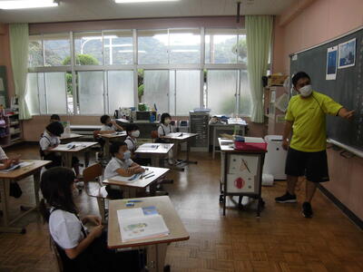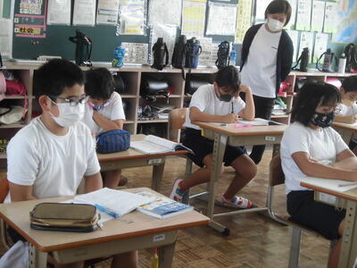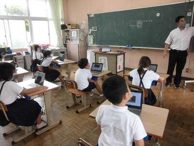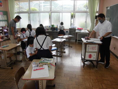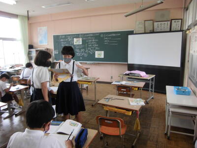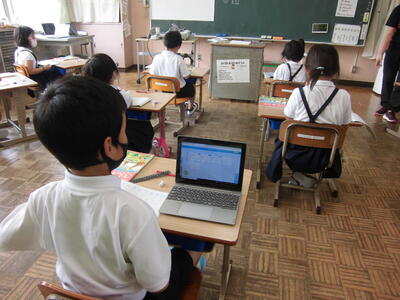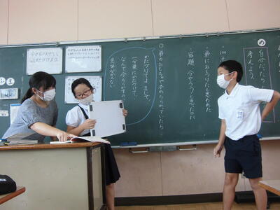 今日は、天草市教育委員会の先生、御所浦中学校の先生、東京からの学生さん(キャラバン隊)が来校されました。2時間目の5年生の国語の授業では、タブレット端末に自分の考えを残しながら、話し合いが行われました。児童は、緊張しながらも話し合いが少しずつ活発になっていく姿が見られました。緊張の中での授業、これも大切な経験です。