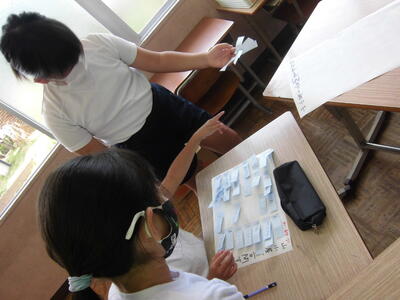 自分の考えを付箋に書き、友だちの意見と整理しながら考えをまとめていきます・・・。