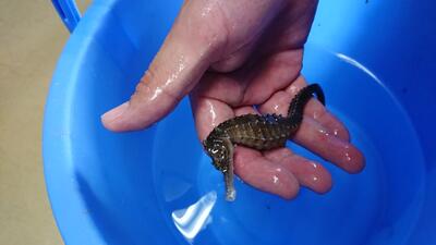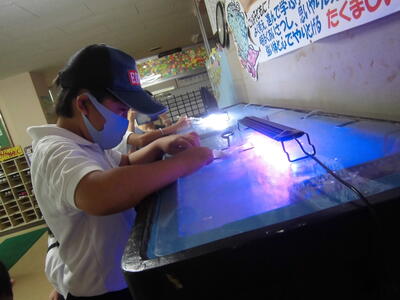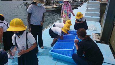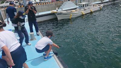 これまでヒラメや車エビの稚魚放流を経験させていただきましたが、今日はマダイの放流を体験しました。稚魚のつかみ方にも慣れてきたのか、これまで以上にスムーズに放流できていたと思います。