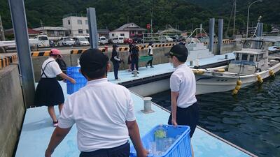 7月23日(水)、御所浦小中合同でボランティア活動を実施しました。中学校の生徒さん方がリードしながら、自分たちの地区で清掃活動に取り組みました。お菓子の袋やペットボトルなどのゴミを拾い、御所浦の環境をさらにきれいにしてくれた子どもたちです。ちなみに、写真の奥に見えるのは八代海です。遠くには九州山地も、うっすらと姿を見せていました。美しい景色と捨てられたゴミの対照が、なんとも印象的でした。