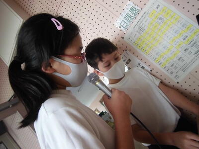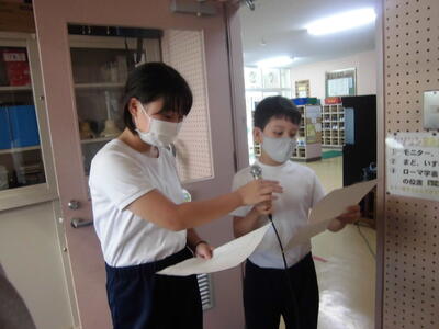 「こんにちは。白団団長の〇〇と赤団団長の〇〇です。今から、今年度の小中合同運動会のスローガンの発表とそのスローガンに込められた思いをみなさんにお伝えします。今年度の小中合同運動会のスローガンは「Be Together みせろ!107人の御所っ子魂」です。英語の「Be Together」には「小学生と中学生がひとつになって、いっしょにがんばろう、団結しよう」という意味がこめられていて、「107人の御所っ子魂は、小学生と中学生全員の運動会に対する強い思いがこめられています。このスローガンを達成するために、まずは明日の結団式をすばらしいものにしましょう。これで放送を終わります。」