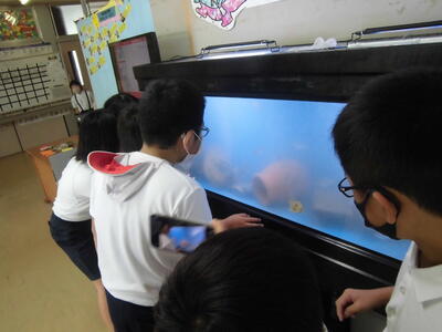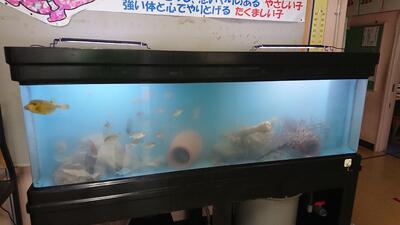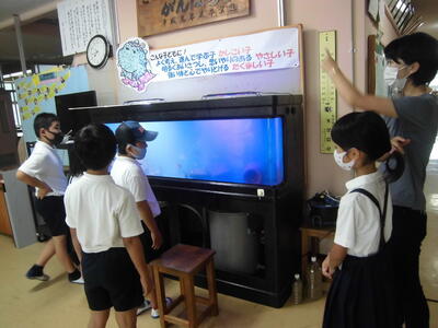 朝から子どもたちに囲まれる「ごしょっこ水族館」。今日も「わあ、きれいになってる!」と声をあげながら、1・2年生の子どもたちが水槽をのぞき込んでいました。昨日の放課後、保護者の方が掃除と海水の入れ替えをしてくださったおかげです。水槽の中では、鯛の稚魚がすくすくと成長しています。