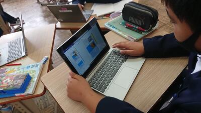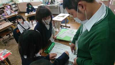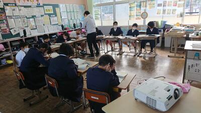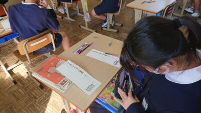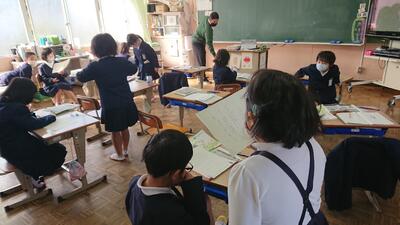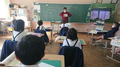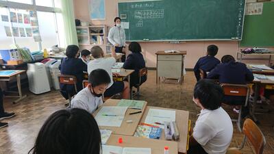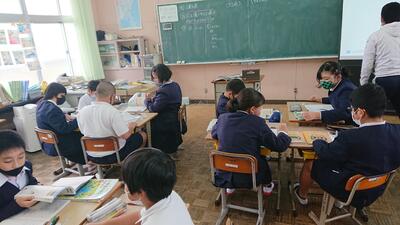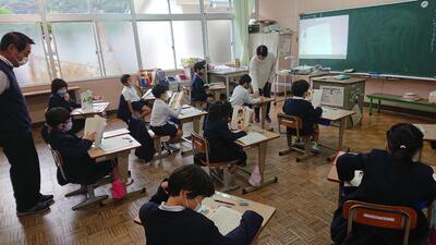 今日は、天草市教育委員会の先生、御所浦中学校の先生、東京からの学生さん(キャラバン隊)が来校されました。2時間目の5年生の国語の授業では、タブレット端末に自分の考えを残しながら、話し合いが行われました。児童は、緊張しながらも話し合いが少しずつ活発になっていく姿が見られました。緊張の中での授業、これも大切な経験です。