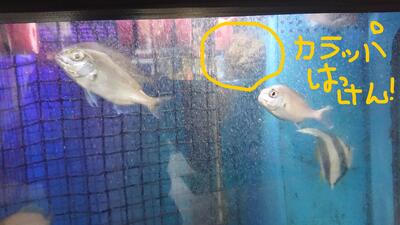 御所浦:御所っ子水族館、少しずつ、少しずつ、カラッパが登頂に成功しました!