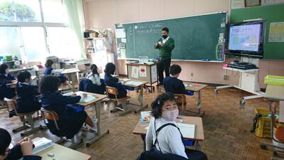 本日、新しいALTのセオドア先生が着任され、歓迎会を実施しました。7月末にアメリカから日本に来られたばかりで、今、日本語の勉強中なのだそうです。しかし、自己紹介では、流暢な日本語でスピーチされました。早速、1時間目から6年生の授業に入っていただきました。出身地やご家族のことについて話され、子どもたちも笑顔で授業を受けていました。