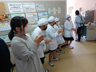 コンテナ室前の消毒と問診は給食当番の衛生はコロナ前から実施中・・・。