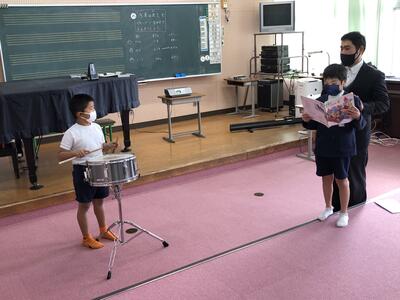 2年生の音楽の様子です。「汽車は走る」のリズム打ちです。歌、小太鼓、木琴を使って、だんだん速くなるリズムをうちます。お互いに目を合わせながら、リズムを合わせていきます。