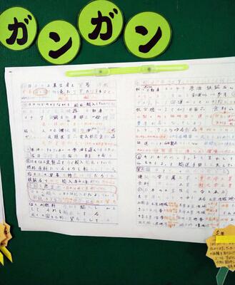3年生は、漢字の音と訓を使ってカルタをつくる学習です。カルタなのでできるだけ「5・7・5」などリズムよい文にするという条件付きです。「た:旅するぞ!大きい旅館にとまりたい」など一つの漢字の音と訓を使って読み札をつくります。
