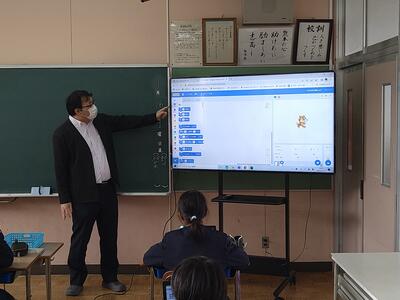 今日は、5年生が「スクラッチ」というソフトを使って学習しました。担任の先生とICT支援員の先生2人での授業です。