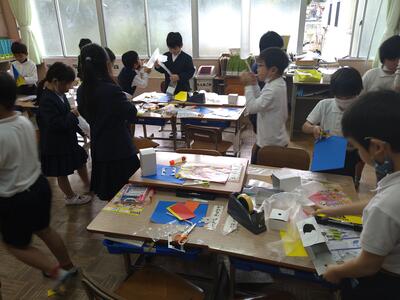 こちらは、アウトドアクラブ。今日は、雨のため、室内で何やら段ボールで飾っていました。なんと、お化け屋敷を作っていました。進む通路を作ったり、びっくり箱の中から、自分たちが飛び出すしかけを作ったり、楽しみながら活動していました。