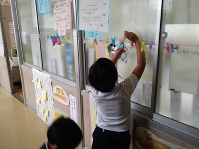 廊下に並んだ七夕飾り。思い思いの願いが綴られた短冊に目を通すと、心が温かくなります。「てっぽうのおもちゃをかってもらえますように」「つりとはぜとりがじょうずになりますように」「おけしょうがじょうずになりますように」「成人したら先生とお酒がのめますように」・・・職員も児童も、それぞれの願いが叶うといいですね。
