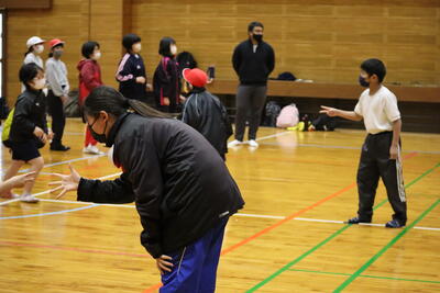 「お!! これは下手投げ?」「あたったー」6年生さすがにやさしく投げてくれます。