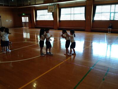 「貨物列車」を体育館を駆け回りながら、「ジャンケンポーン」「あいこでしょ」