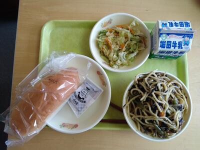 今日の給食は ひじきスパゲッティ! コッペパン さきいかサラダ 牛乳です。