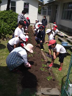1・2年生教室横の生活科園では、トマト、オクラ、ピーマン、枝豆を植えていきます。
