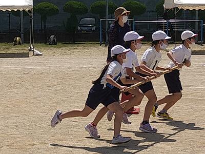 1、2年生での初めてのリレー練習です。全員が色分け、番号わけされたゼッケンをつけているので、渡し間違えはありません。誰が誰に渡すのか、追い越すときは外からなど、指導の後、実際にリレーが行われました。1番内側を走るように先生も一緒によ~いドン!