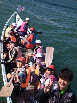 4年生は、勇志国際高校近くの入り江で伝馬船の体験を行いました。地域の方々のご協力をいただきながら、全員が艪をこいで舟を進める貴重な経験をしました。風が吹く中での操縦は容易ではなく、悪戦苦闘しながらも和船ならではの操船を体感することができました。 ※伝馬船(てんません)とは、日本で使われた木造の小型和船で、本船と岸の間で荷物や人を運ぶために用いられた船です。