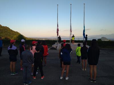 船に乗って棚底港に移動。そこに倉岳小学校の皆さんが待っていてくれました。結団式で気持ちを高めます。