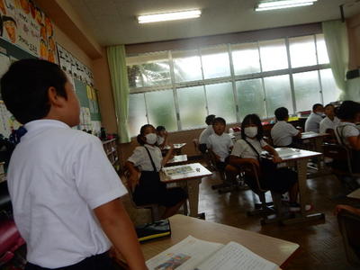 今日は、天草市教育委員会の先生、御所浦中学校の先生、東京からの学生さん(キャラバン隊)が来校されました。2時間目の5年生の国語の授業では、タブレット端末に自分の考えを残しながら、話し合いが行われました。児童は、緊張しながらも話し合いが少しずつ活発になっていく姿が見られました。緊張の中での授業、これも大切な経験です。