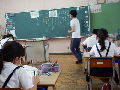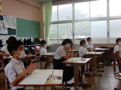 今日は、天草市教育委員会の先生、御所浦中学校の先生、東京からの学生さん(キャラバン隊)が来校されました。2時間目の5年生の国語の授業では、タブレット端末に自分の考えを残しながら、話し合いが行われました。児童は、緊張しながらも話し合いが少しずつ活発になっていく姿が見られました。緊張の中での授業、これも大切な経験です。