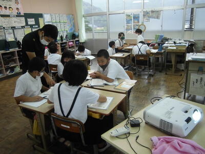 今日は、天草市教育委員会の先生、御所浦中学校の先生、東京からの学生さん(キャラバン隊)が来校されました。2時間目の5年生の国語の授業では、タブレット端末に自分の考えを残しながら、話し合いが行われました。児童は、緊張しながらも話し合いが少しずつ活発になっていく姿が見られました。緊張の中での授業、これも大切な経験です。