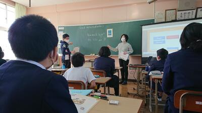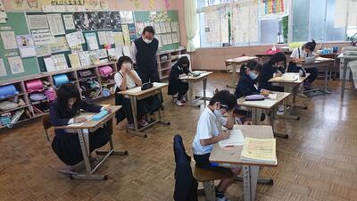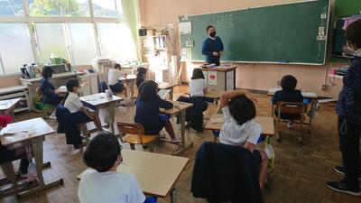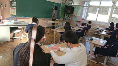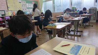 今日は、天草市教育委員会の先生、御所浦中学校の先生、東京からの学生さん(キャラバン隊)が来校されました。2時間目の5年生の国語の授業では、タブレット端末に自分の考えを残しながら、話し合いが行われました。児童は、緊張しながらも話し合いが少しずつ活発になっていく姿が見られました。緊張の中での授業、これも大切な経験です。