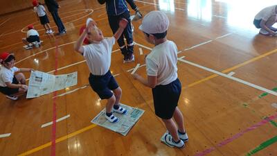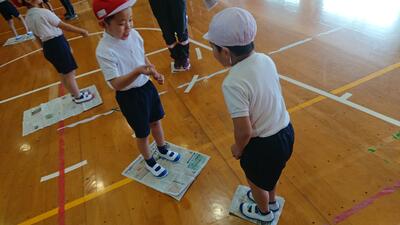 じゃんけんで負けたら新聞紙を1回半分に折りたたむ・・・。